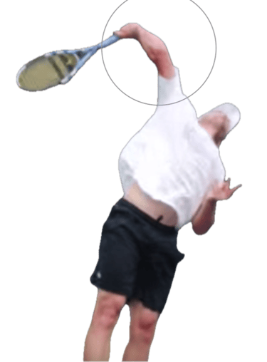 As the torso rotates, the hitting arm lags behind. This lag creates a stretch across the chest and shoulder—storing even more elastic force and being added opposite direction force from the legs and torso. The racquet should feel like it's trailing behind as the elbow leads the motion. Then, in a whip-like release, the arm is accelerated forward by the opposite direction force, creating the high speed of the racket head which is at the most outside of the circle.