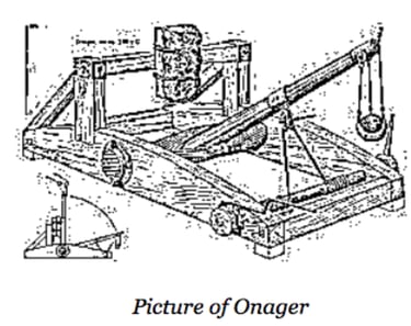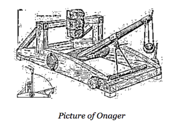 For tennis swing, we don’t have the trebuchet’s counterweight power and the lever system, so the power source of this machine is different from the tennis swing even though the system of long arm and sling is adapted by tennis swing. But there is a machine named Onager that is more like a mechanical structure of tennis swing: instead of the counterweight, the power source of Onager is powered torsion or elastic force, just like tennis swing applies the torsion force restored in the torso during the backswing.
