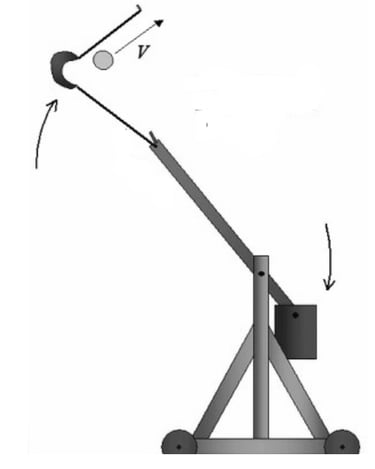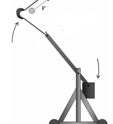 The device consists of a framework that supports a freely revolving launch arm. On one side of the arm, a heavy counterweight is attached; on the other, a long sling containing the projectile. When the trigger is released, the counterweight falls, the weighted short arm is driven by gravity into an accelerating pendulum motion, causing the lighter, long arm of the lever to revolve around the fulcrum at the opposite arc, which in turn, pulls the sling and its contents into a whipping motion at the end of the long arm, forcefully propelling the side of the arm with the sling into the air. The sling then spins in a circular motion around the end of the arm(as the center of a circle and the sling is radius) , further increasing the speed of the projectile before it is released.